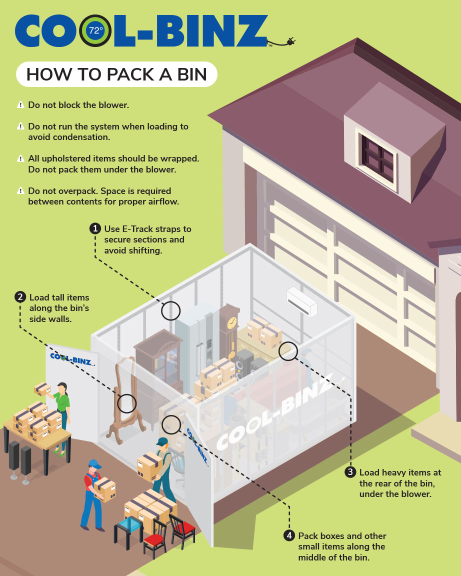 For better weight distribution, we recommend placing heavier items toward the back of the bin, under the blower. However, avoid putting heavy, upholstered furniture directly under the blower, and always wrap these items before packing. Never load items directly in front of the blower.